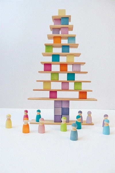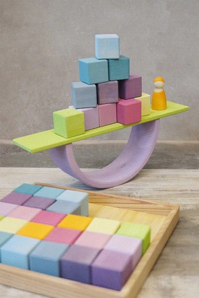Ein ganz grundlegender Baustein ist ein Holzwürfel mit Kantenlänge 4cm. In diesem schönen Holz-Bausteinset Viereck Pastell von Grimm´s Spiel- und Holzdesign bekommen Sie 36 solcher Würfel in wunderschönen Pastellfarben. Angeordnet sind sie auf einem Holztablett, so können sie auch als Legespiel oder Puzzle genutzt werden.